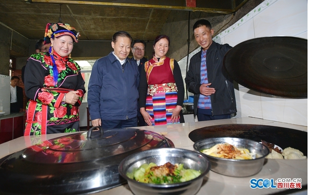 ▲4月26日,省委书记彭清华到小金县达维镇冒水村调研。在已脱贫群众周兴云家中,彭清华走进干净整洁的厨房,揭开灶台锅盖、打开冰柜,看到热气腾腾的饭菜、冷冻储藏的腊肉,十分高兴。