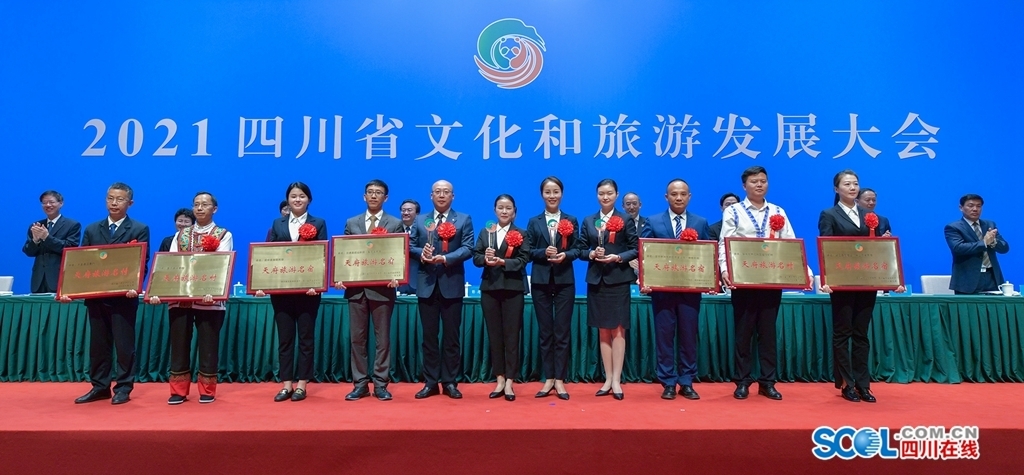 会上,省委常委、宣传部部长甘霖宣读第三批天府旅游名县、首批天府旅游名牌(名镇、名村、名宿、名导、名品)命名文件,彭清华逐一向获得命名的天府旅游名县授牌,彭清华、黄强、邓小刚等向首批天府旅游名牌获得者代表授牌。九寨沟县、省文物考古研究院、华强方特集团、交通运输厅负责同志作交流发言。会议宣布南充市为2022四川省文化和旅游发展大会承办地并授旗。