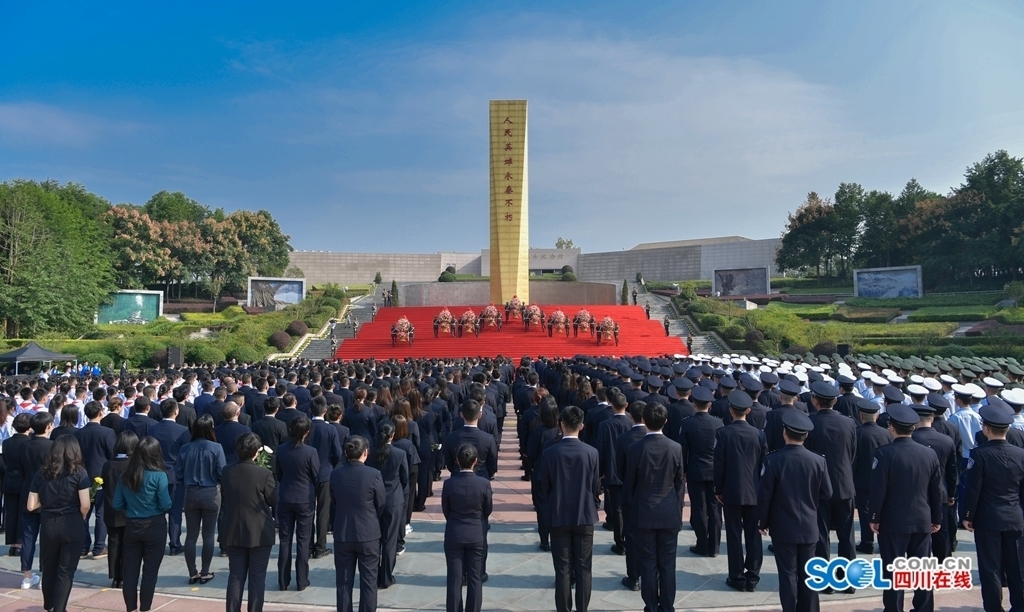 成都市烈士陵园,松柏苍翠、庄严肃穆。追思大道一侧陈列的一幅幅图片,展示了不同历史时期川籍革命英烈的感人事迹,讲述了他们前仆后继、矢志不渝为民族独立、人民解放和国家富强、人民幸福作出的牺牲和贡献。陵园内,革命烈士纪念碑巍然耸立,“人民英雄永垂不朽”八个大字熠熠生辉。1000余名各界代表,面向纪念碑整齐列队。