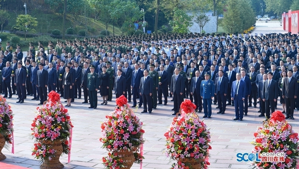 成都市烈士陵园,松柏苍翠、庄严肃穆。追思大道一侧陈列的一幅幅图片,展示了不同历史时期川籍革命英烈的感人事迹,讲述了他们前仆后继、矢志不渝为民族独立、人民解放和国家富强、人民幸福作出的牺牲和贡献。陵园内,革命烈士纪念碑巍然耸立,“人民英雄永垂不朽”八个大字熠熠生辉。1000余名各界代表,面向纪念碑整齐列队。