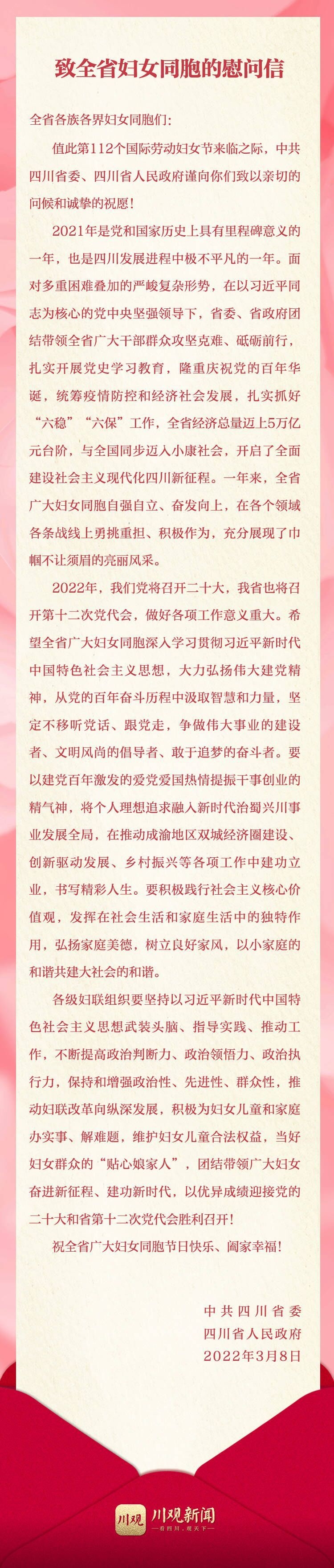 值此第112个国际劳动妇女节来临之际,中共四川省委、四川省人民政府谨向你们致以亲切的问候和诚挚的祝愿!