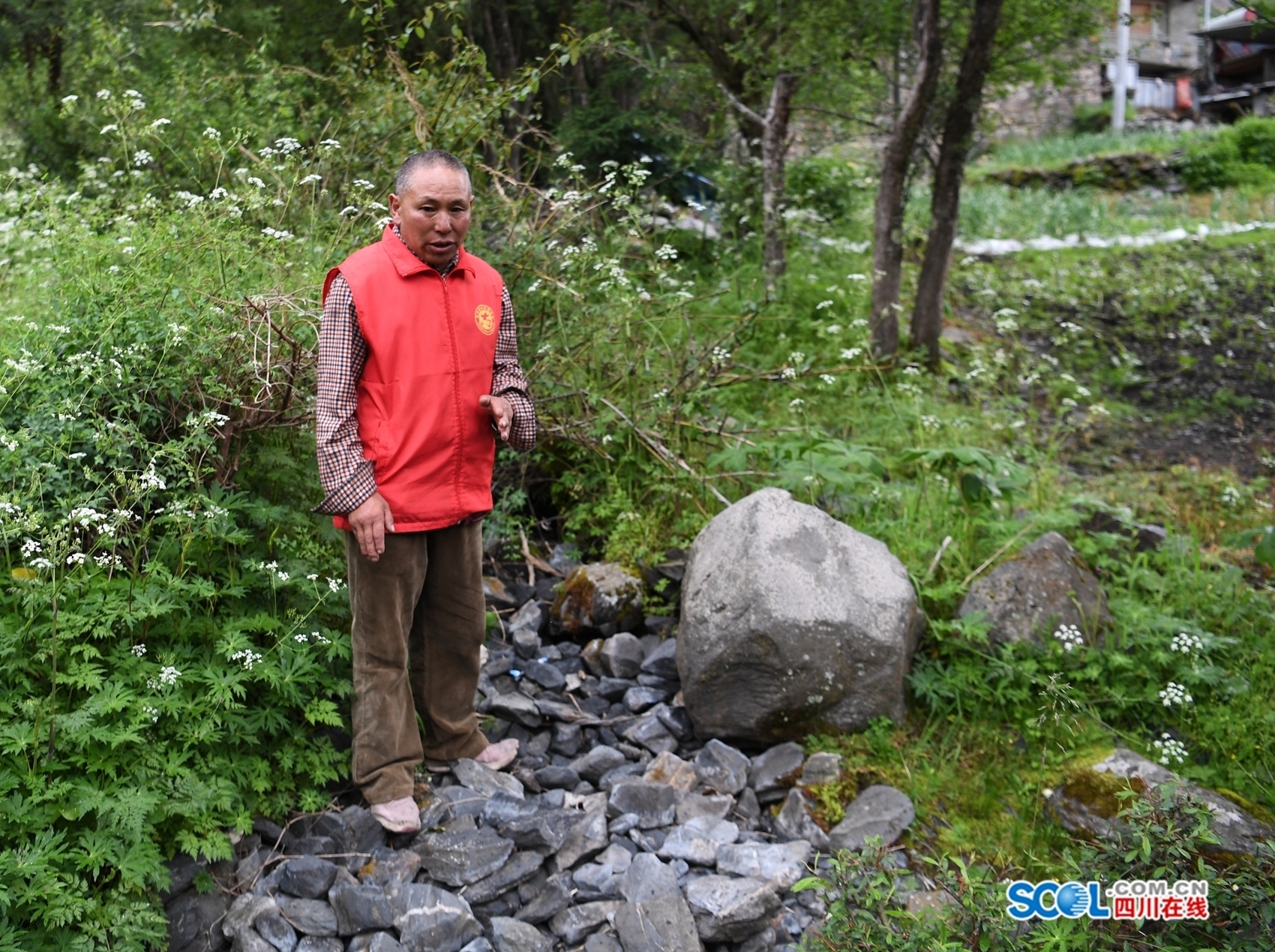 6月9日20时51分,草登乡发生地震后,科拉机村一组组长、地灾监测员然拉木滚,发现房屋周边一条从未断流的小溪断流了,根据培训知识判断接下来可能会发生较大地质灾害,及时组织村民转移、避免12人因灾伤亡。图为然拉木滚和断流的小溪。