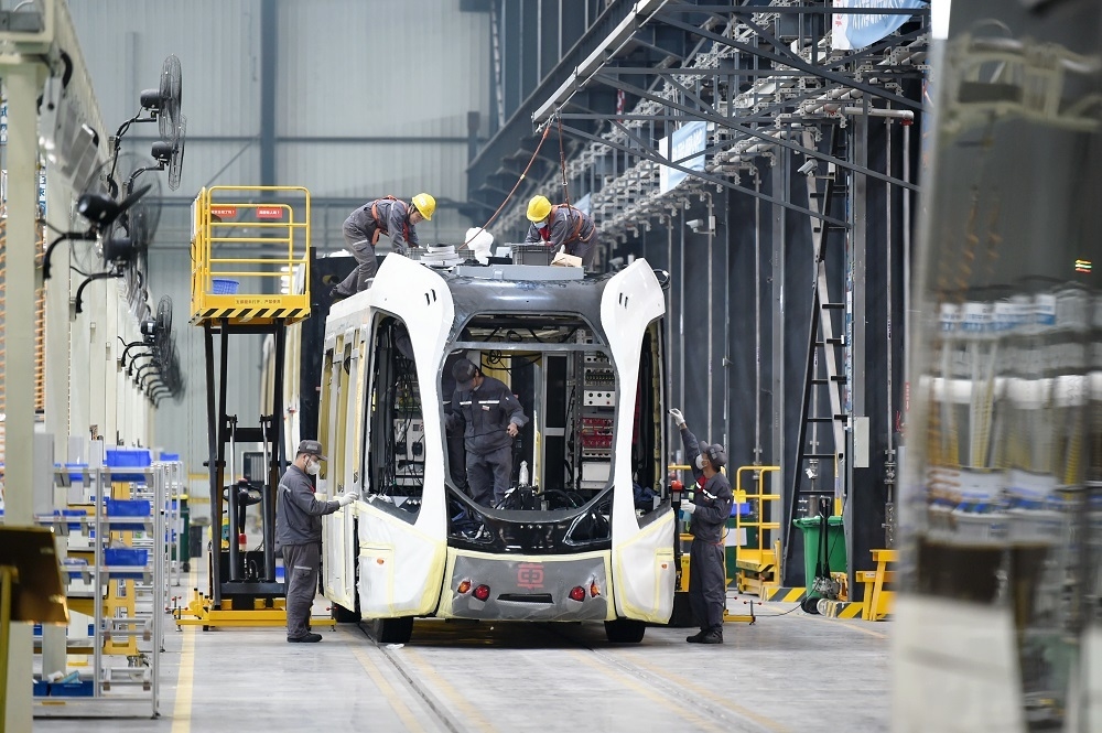 宜宾三江新区的四川中车铁投轨道交通产业基地智轨生产车间,工人们正在组装智轨列车。 王宇 摄