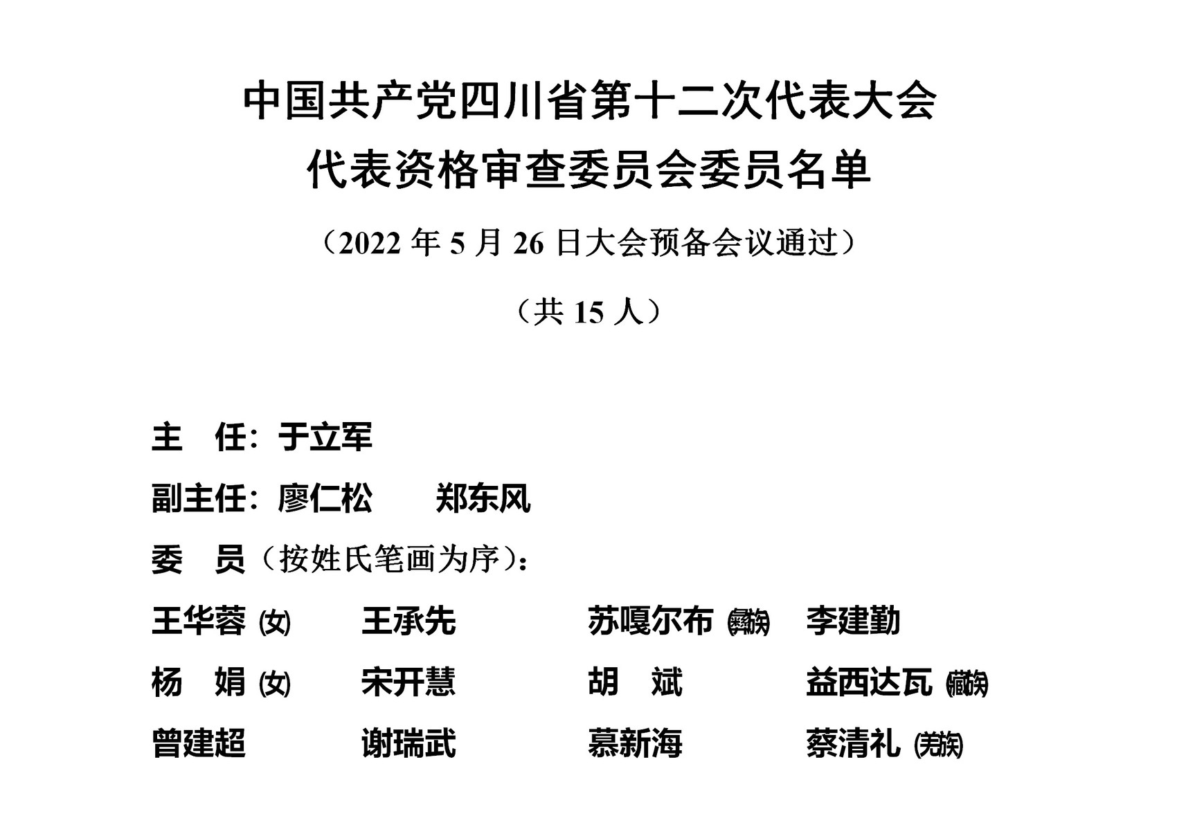 权威发布 | 省第十二次党代会主席团成员名单、秘书长名单、代表资格审查委员会委员名单 来源:四川在线 发布时间:2022-05-26 19:35:50 浏览次数: 次 【字体:小 大】 来源: 四川在线 终审:何晓波 分享到: 关闭本页 【打印正文】