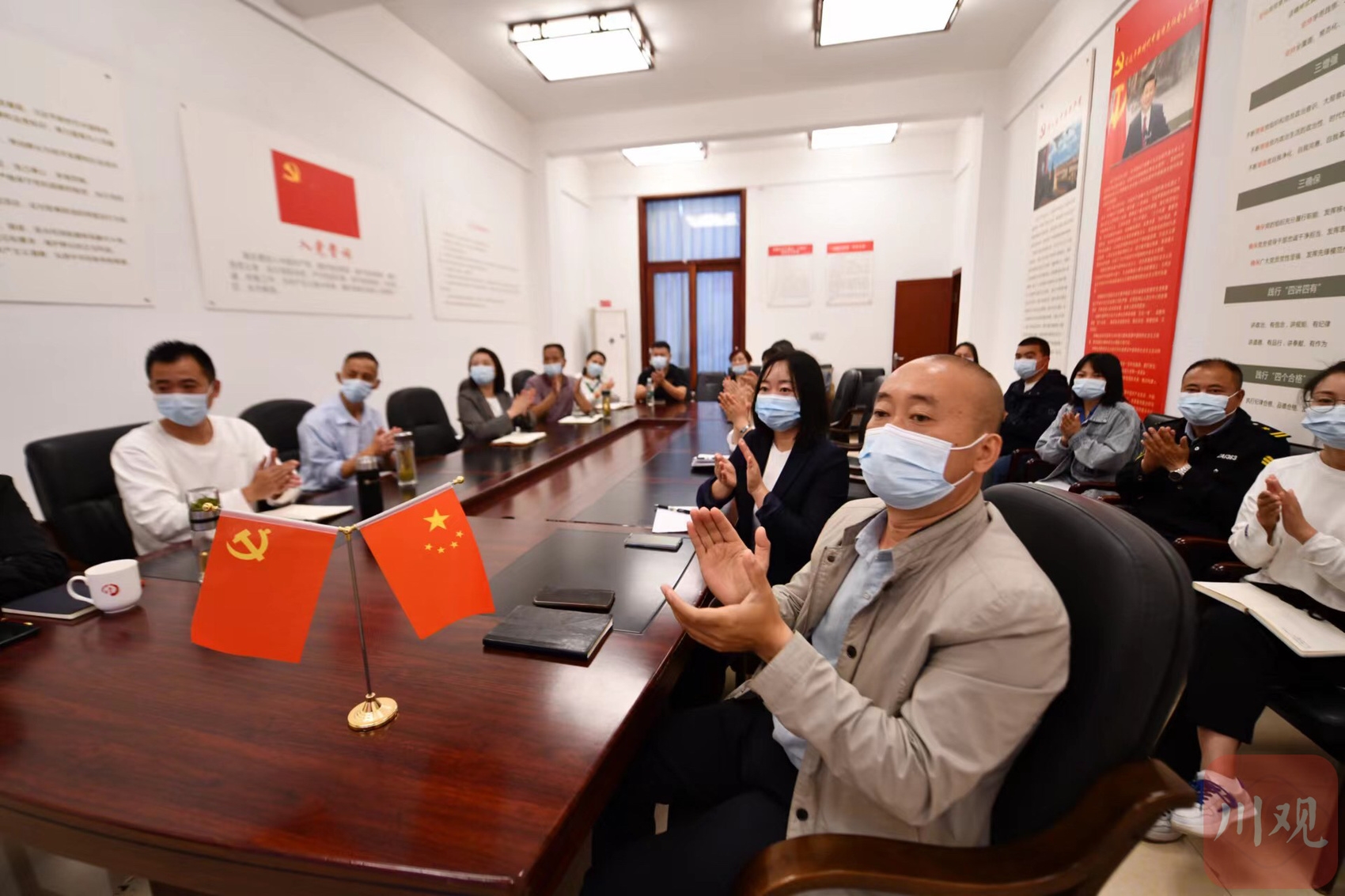 在成都郫都区战旗村村委会会议室,该村20余名党员代表集中收看大会开幕直播。