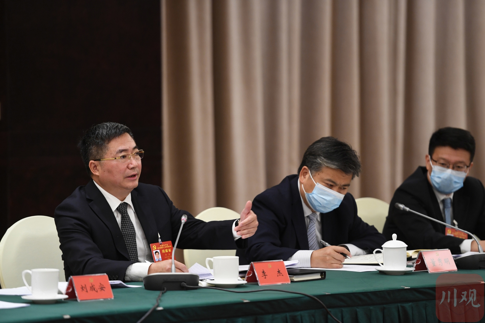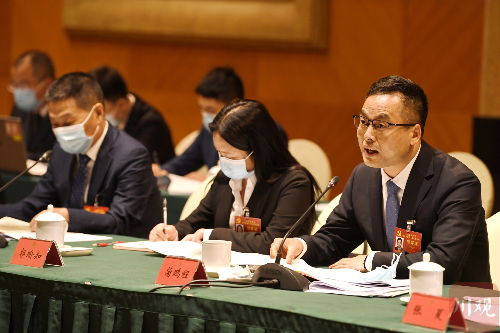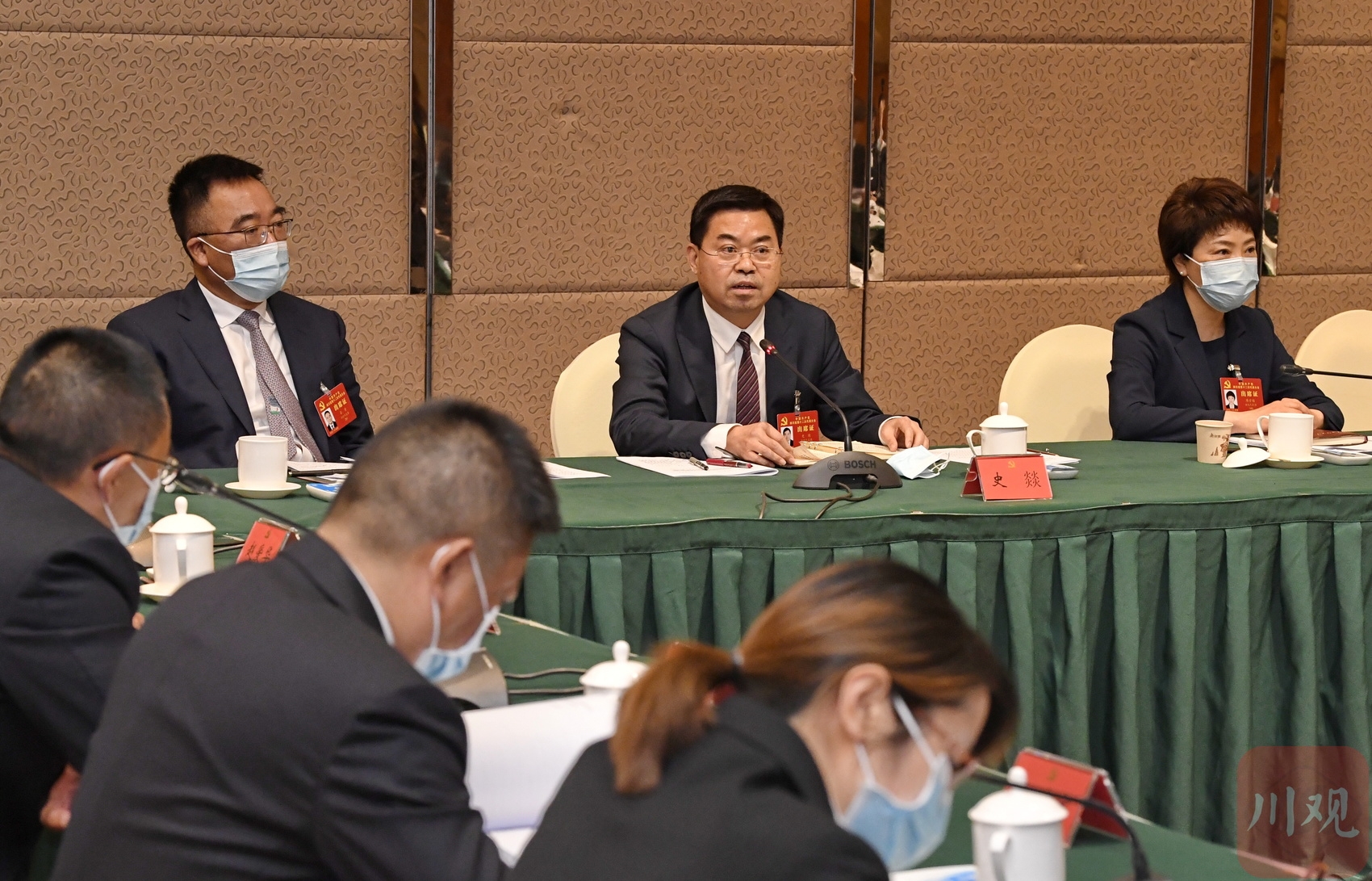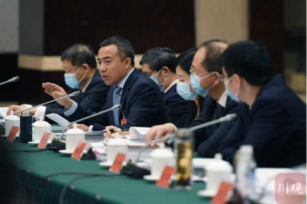 蒲鹏程代表(右一)表示,完全赞同、坚决拥护党代会报告,将在学深学透、转化细化、落地落实上下功夫,切实把省党代会部署要求转化为顺庆行动。