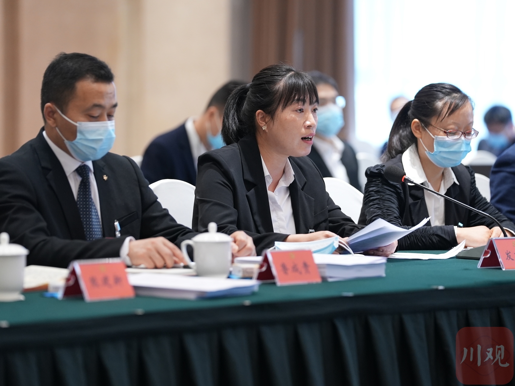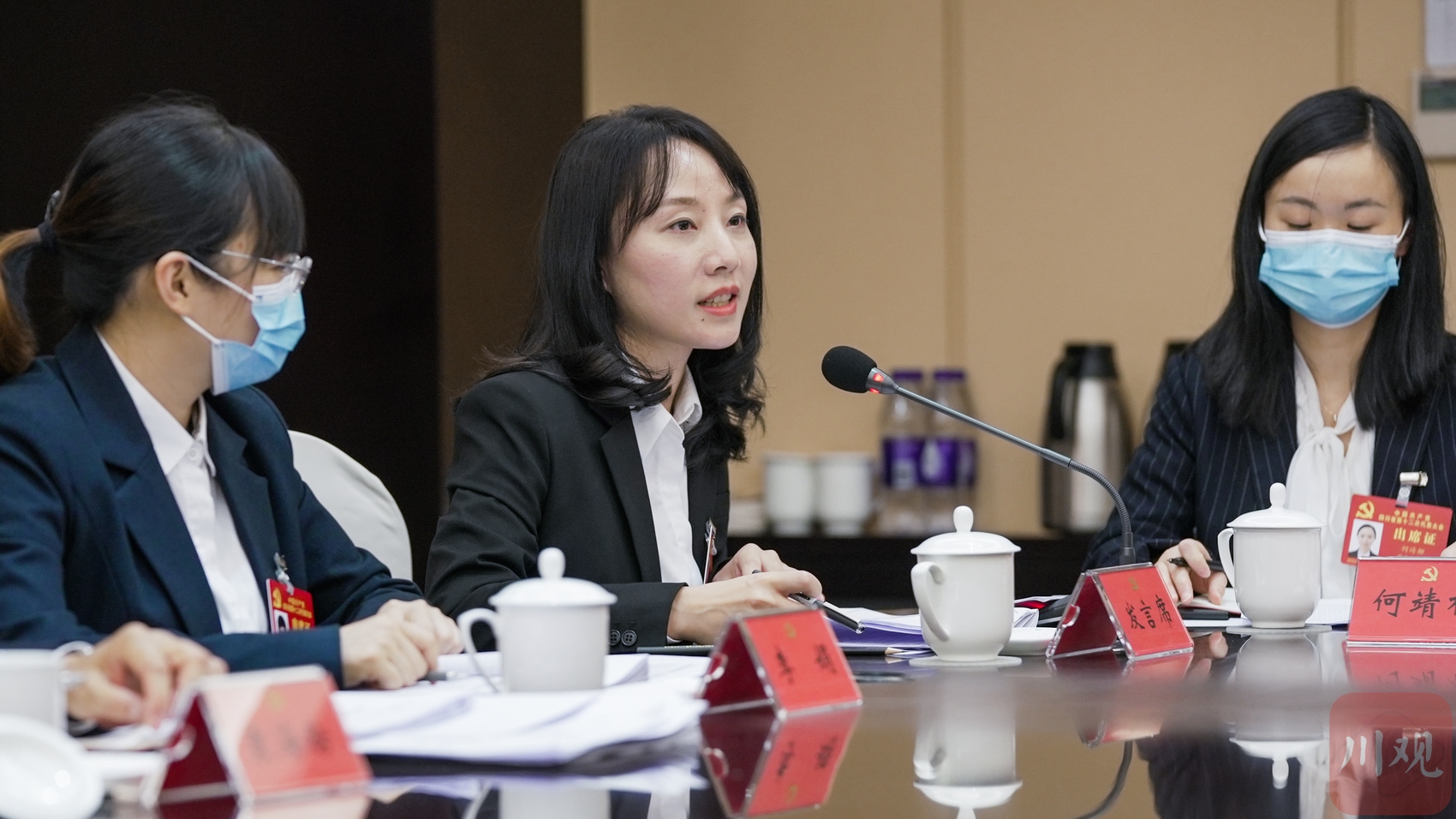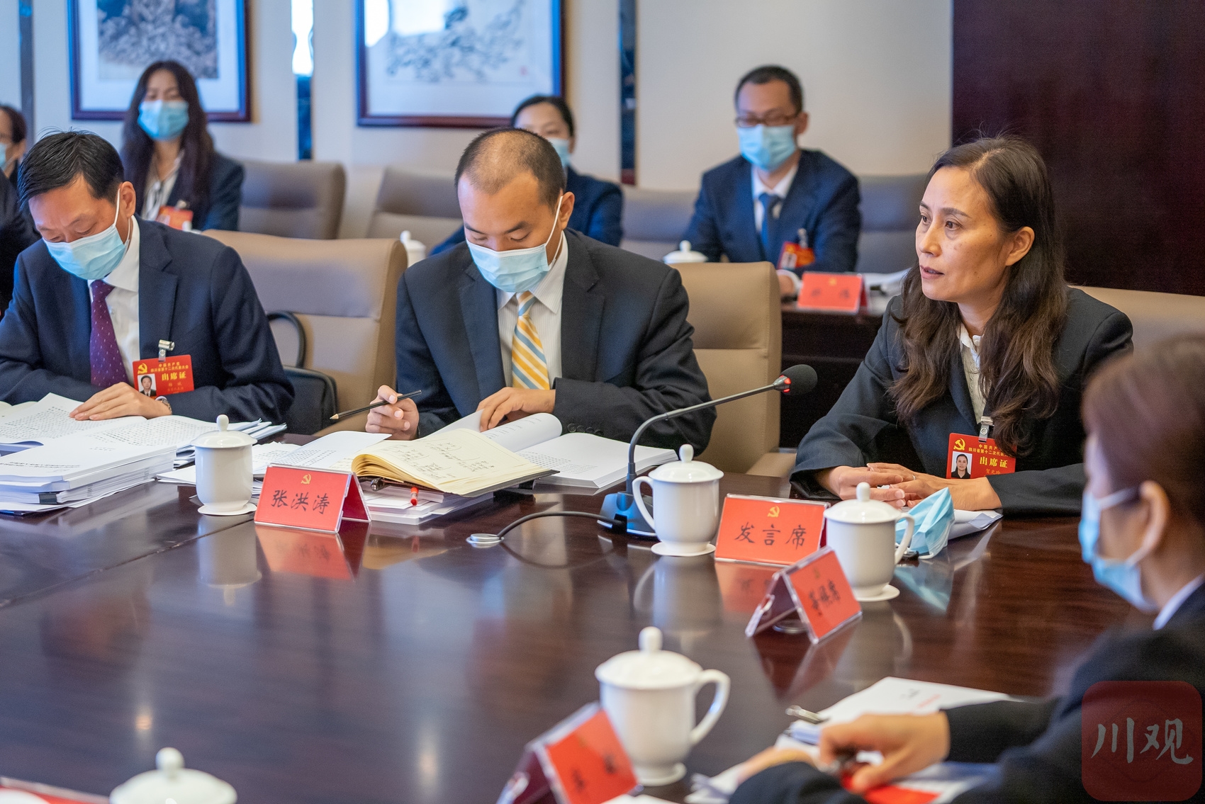 蒲鹏程代表(右一)表示,完全赞同、坚决拥护党代会报告,将在学深学透、转化细化、落地落实上下功夫,切实把省党代会部署要求转化为顺庆行动。