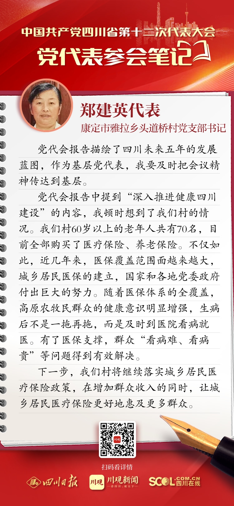 党代表参会笔记丨康定市雅拉乡头道桥村党支部书记郑建英:继续落实医保政策,惠及更多群众