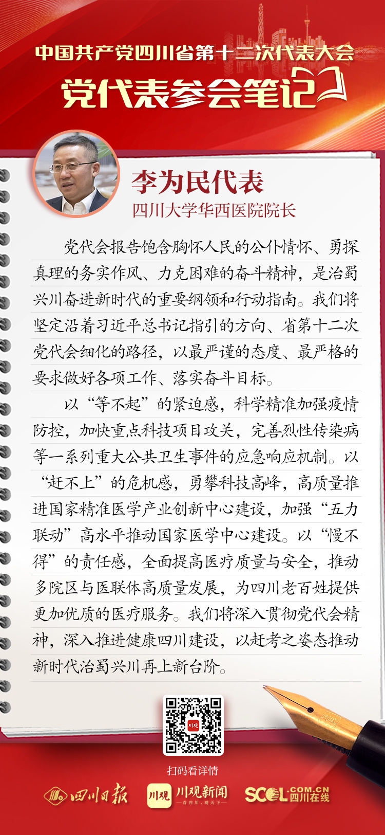 党代表参会笔记丨四川大学华西医院院长李为民:为老百姓提供更加优质的医疗服务
