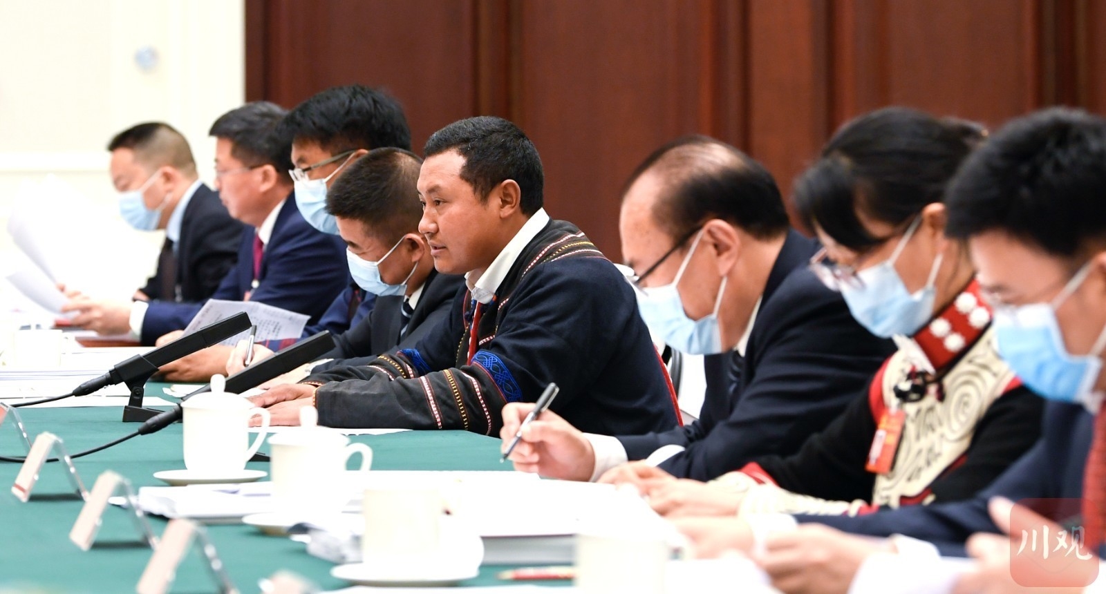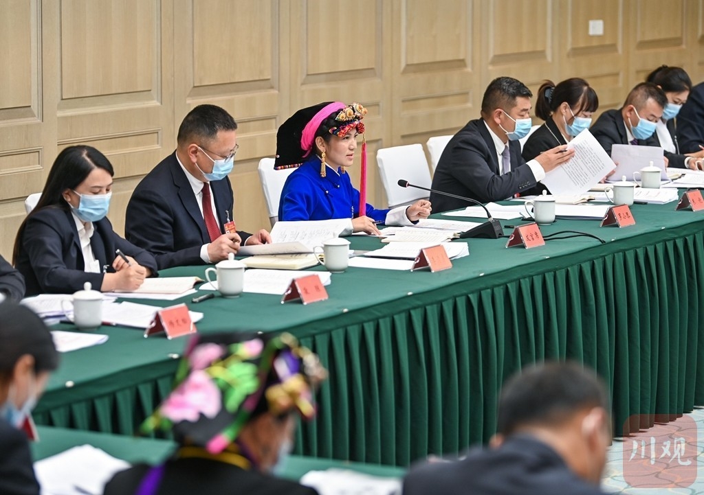 来自凉山州昭觉县三岔河镇三河村的洛古有格代表(右四)说:“继续努力带领家乡群众共同致富,把富民产业发展好,把脱贫攻坚成果巩固好,把家园建设好。”