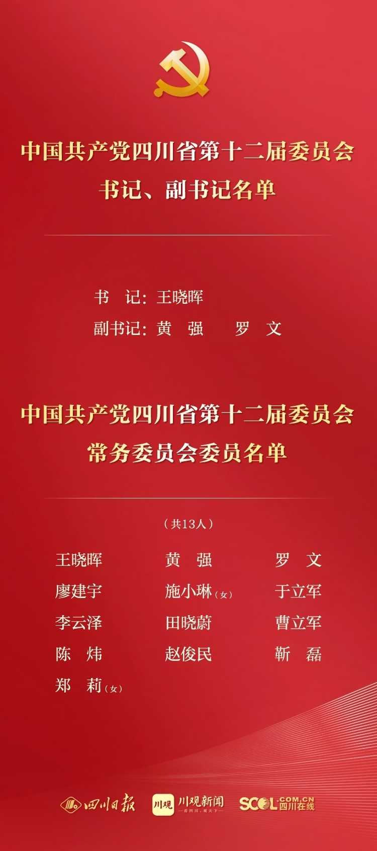 5月30日下午,中国共产党四川省第十二届委员会第一次全体会议在成都举行。会议选举产生了中国共产党四川省第十二届委员会常务委员会委员和书记、副书记。