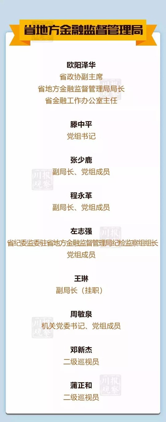 根据《四川省机构改革方案》,将省金融工作局更名为省地方金融监督管理局,加挂省金融工作办公室牌子。作为省政府直属机构,负责统筹做好全省地方金融监督管理工作。