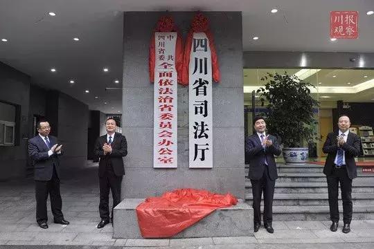 11月15日,中共四川省委全面依法治省委员会办公室和重新组建的四川省司法厅正式挂牌。副省长叶寒冰,省政府副秘书长王占良与省司法厅党委书记、厅长刘志诚,省司法厅党委副书记、副厅长王彬共同为两块牌子揭牌。