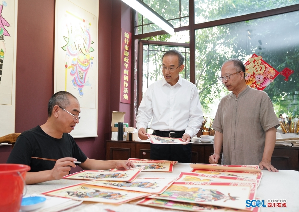 黄强走进绵竹市孝德镇年画村绵竹年画展示馆,察看绵竹年画刻版、印墨、施彩等技艺,询问年画产业发展和助农增收等情况。