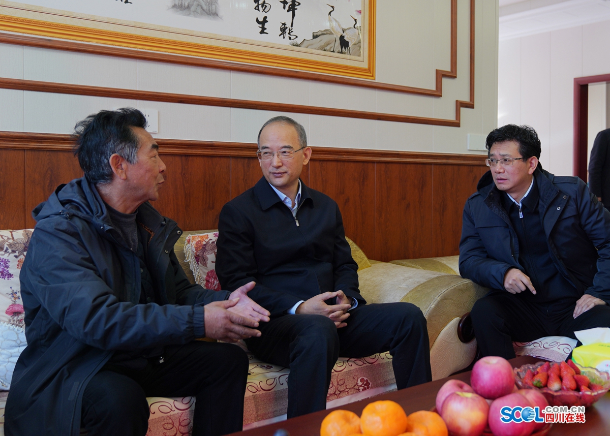12月27日,黄强来到泸定县磨西镇咱地村受灾群众曹忠全整洁明亮的新家中,代表省委省政府送上新年祝福,鼓励大家依靠勤劳双手把日子过得越来越红火。