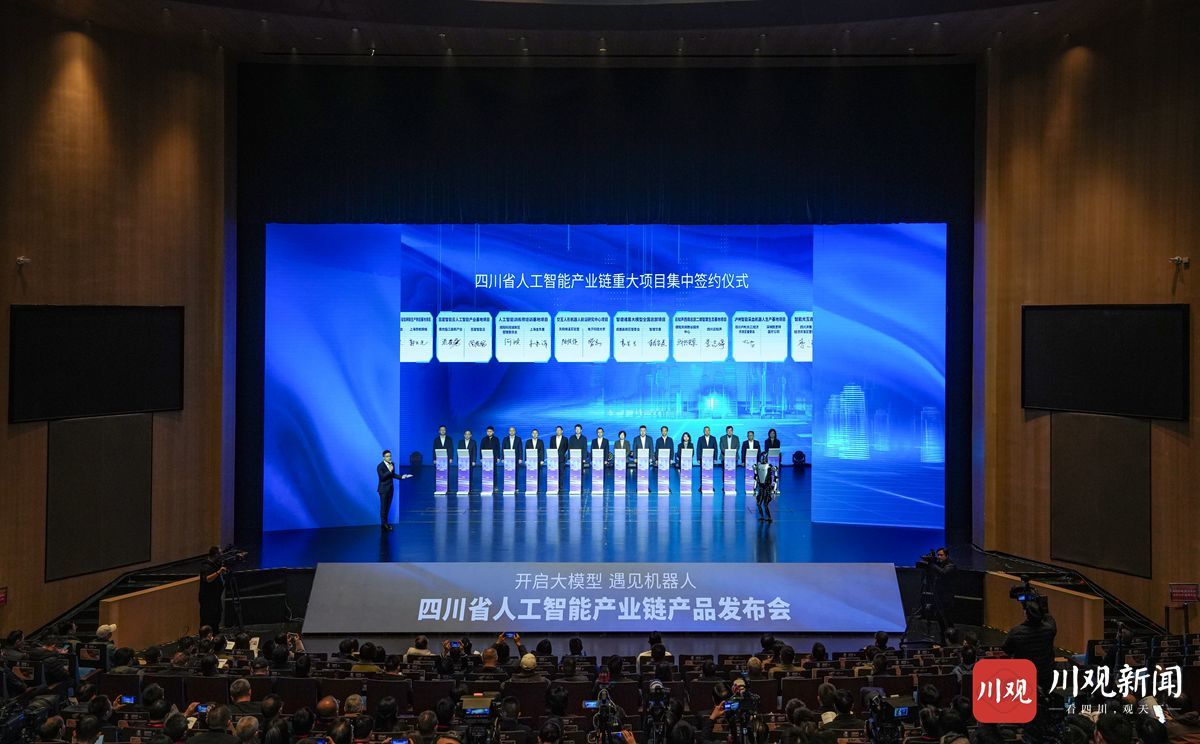 会上,省委常委、常务副省长董卫民致辞,科技厅负责人发布《四川省促进人工智能产业链发展若干政策》,一批人工智能产业链重大项目进行集中签约。会上还发布和展示了一批“四川造”人形机器人、机器犬、工业机器人、外骨骼机器人等智能机器人产品,以及民生、制造、文旅、政务等领域大模型产品,中国工程院院士谭建荣等专家进行了点评。大会还同步打造了“智体空间·AI运动场”“愈见未来·AI生命舱”等场景展区,让公众近距离体验四川人工智能领域的技术突破和创新应用。
