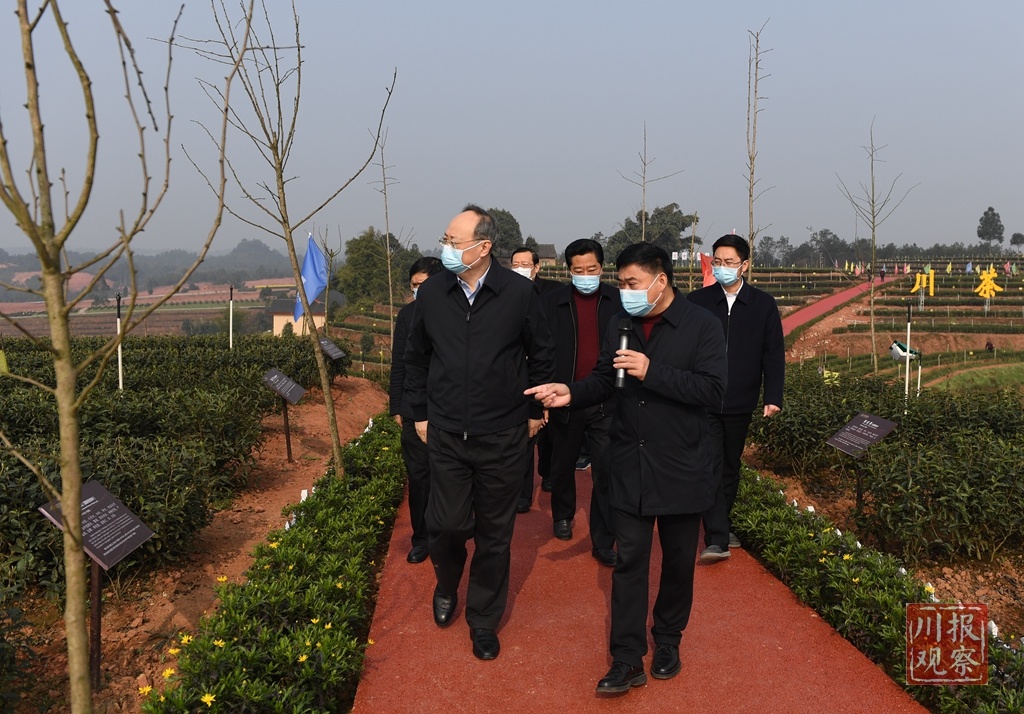 尹力在翠屏区金秋湖镇邱场村,调研川茶集团茶树品比示范园规划建设和优良茶树品种培育情况。