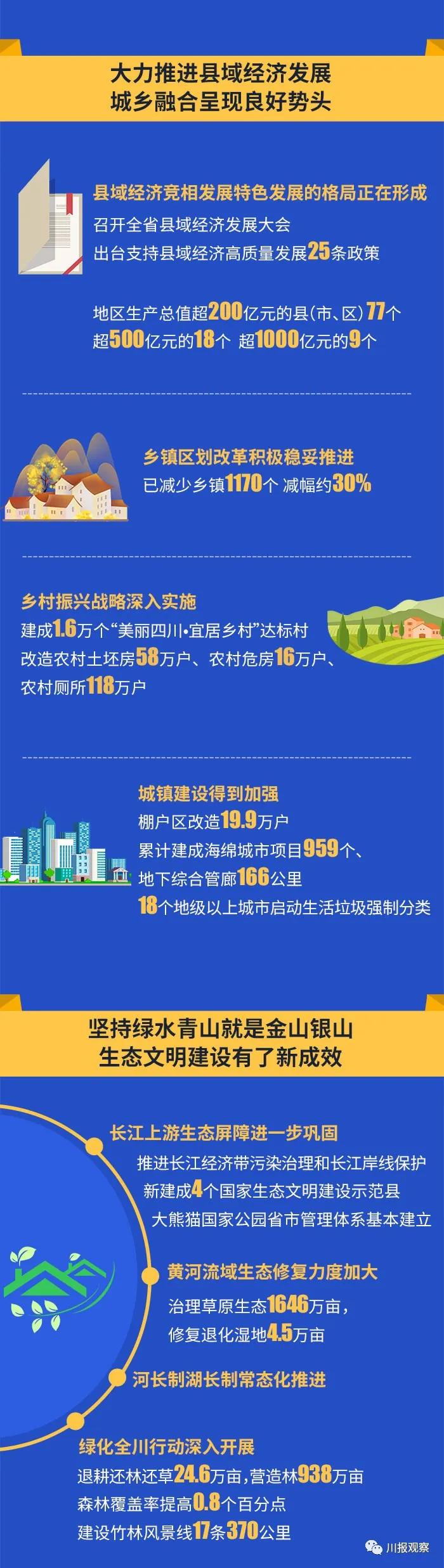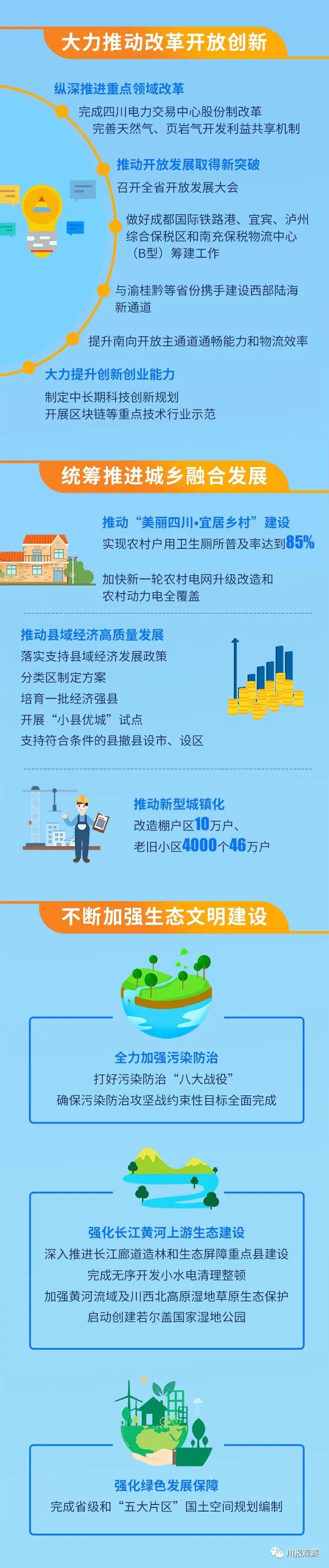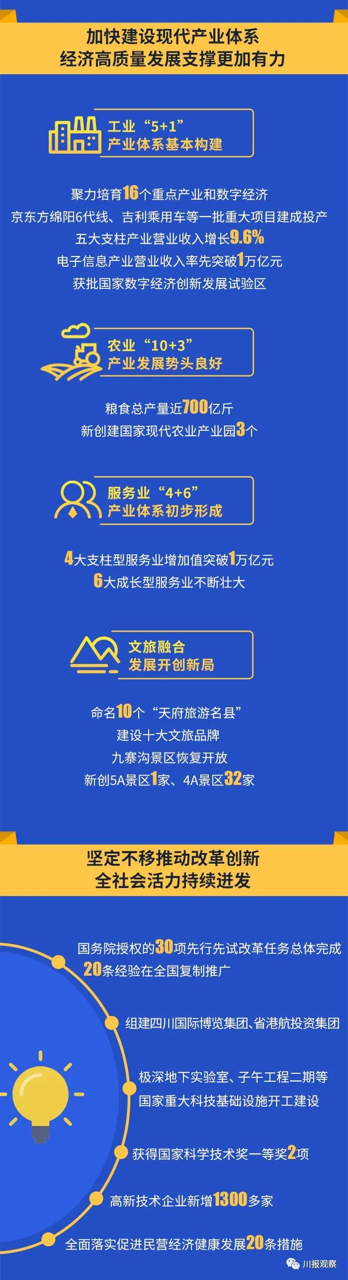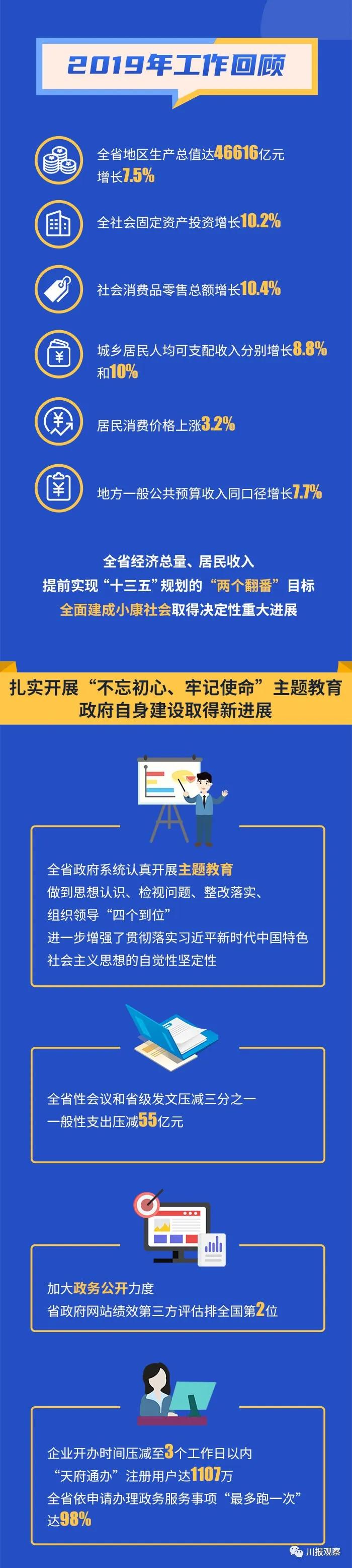 尹力说,去年,我们全面贯彻落实习近平总书记对四川工作系列重要指示精神,圆满完成了省十三届人大二次会议确定的目标任务。全省地区生产总值达46616亿元、增长7.5%,全社会固定资产投资增长10.2%,社会消费品零售总额增长10.4%,城乡居民人均可支配收入分别增长8.8%和10%,居民消费价格上涨3.2%,地方一般公共预算收入同口径增长7.7%。全省经济总量、居民收入提前实现“十三五”规划的“两个翻番”目标,全面建成小康社会取得决定性重大进展。报告回顾了一年来政府所做的工作和成效:扎实开展“不忘初心、牢记使命”主题教育,政府自身建设取得新进展;坚持把稳增长放在突出位置,经济运行保持在合理区间;全力以赴打好三大攻坚战,为全面建成小康社会奠定决定性基础;大力推进“一干多支、五区协同”“四向拓展、全域开放”,区域协同开放发展迈出坚实步伐;加快建设现代产业体系,经济高质量发展支撑更加有力;坚定不移推动改革创新,全社会活力持续迸发;大力推进县域经济发展,城乡融合呈现良好势头;坚持绿水青山就是金山银山,生态文明建设有了新成效;全力保障改善民生和加强社会治理,群众的获得感幸福感安全感不断增强。