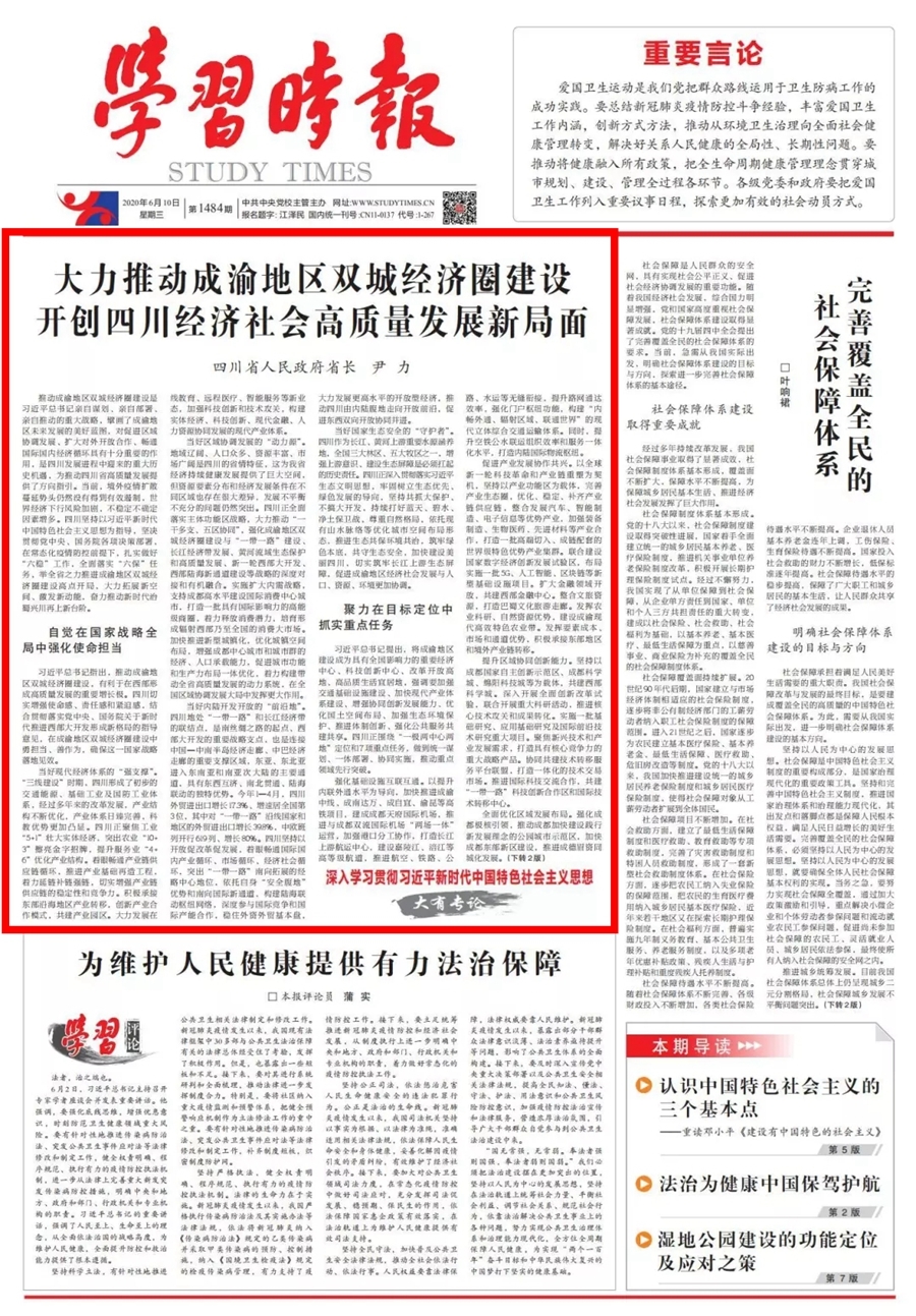 6月10日,《学习时报》头版头条“深入学习贯彻习近平新时代中国特色社会主义思想·大有专论”栏目刊载中共四川省委副书记、省长尹力的署名文章《大力推动成渝地区双城经济圈建设 开创四川经济社会高质量发展新局面》,四川在线今日予以转载: