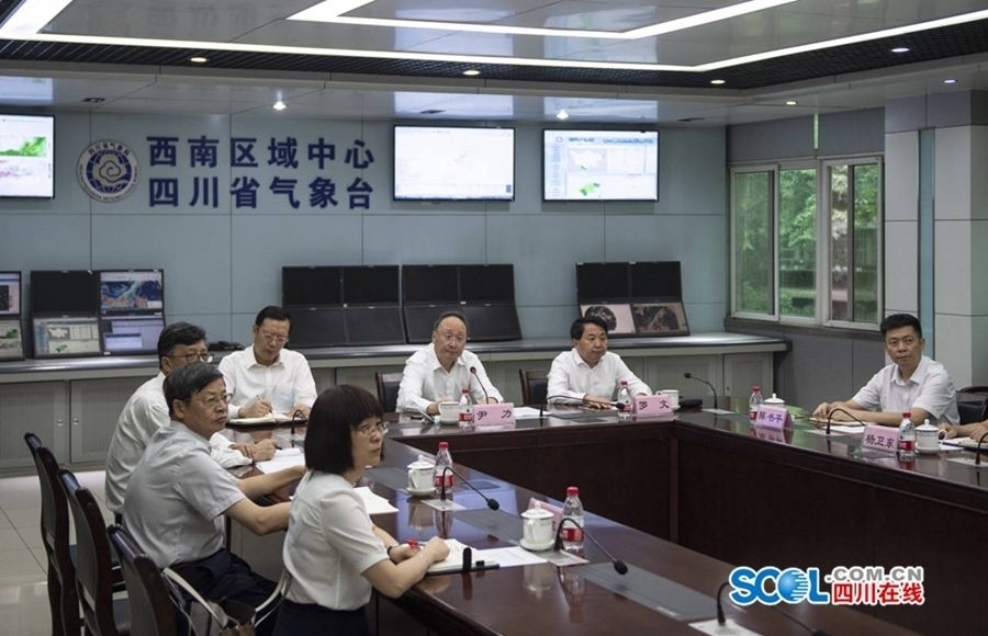 尹力在省气象局连线德阳市和绵阳市,听取重点区域抗洪抢险工作情况汇报。