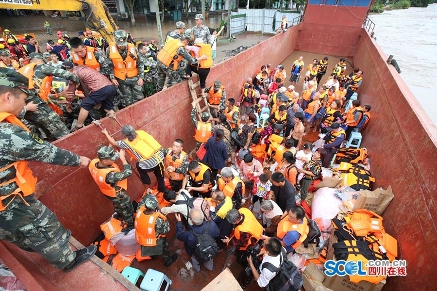 救援人员从乐山凤洲岛转移被洪水围困人员。胡嘉岩 摄(视觉四川)