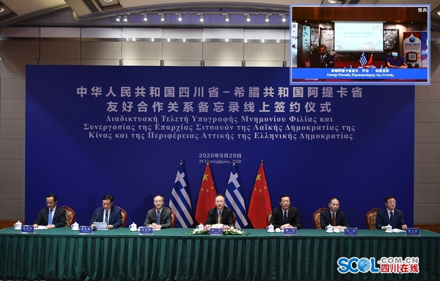 四川在线消息(记者 胡彦殊 邓翔沣 摄影 田为)9月29日,我省与希腊阿提卡省签署友好合作备忘录,共同推动旅游、贸易、科技、教育、文化等领域的战略对接和务实合作。省委副书记、省长尹力,希腊阿提卡省省长帕图里斯分别代表双方在线上签约并致辞。