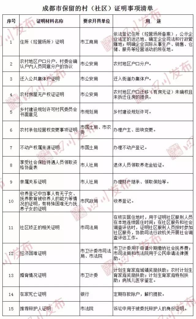 日前,四川省政府办公厅印发《关于推广成都市清理村(社区)证明经验做法的通知》(以下简称“通知”),要求各地要参照成都市经验做法,对本地各级、各部门要求村(社区)开具的各类证明材料进行集中清理,依法规范群众办事要素材料,坚决取消不合法、不合理以及主要为规避部门责任要求办事群众提供的各种证明、佐证材料,最大限度减少证明事项数量,切实解决群众办证难、办事难问题。