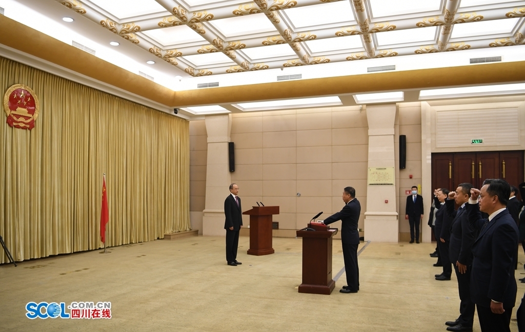 宣誓后,黄强作讲话。他要求大家牢记誓言、践行诺言。要讲政治、忠诚于党,深学细悟、真信笃行习近平新时代中国特色社会主义思想,做“两个确立”的坚决拥护者和“两个维护”的坚定践行者;传承红色基因、赓续红色血脉,严守政治纪律、政治规矩,不断提高政治判断力、政治领悟力、政治执行力。要重法治、尊崇宪法,深入学习、坚决贯彻习近平法治思想,做宪法的忠实遵守者和坚定捍卫者;不断强化法治意识、提高法治能力,严格按照法定权限、法定程序履职尽责,把依法行政落实到深化改革、推动发展和维护稳定各个方面。要守初心、服务人民,坚持以人民为中心,一切为了人民、一切依靠人民,以造福人民为最大政绩,用心用情用力为人民办实事、做好事;自觉接受人民监督,把顺应人民愿望、维护人民权益、增进人民福祉体现到工作全过程,当好答卷人,请人民审阅,让人民满意。要勇担当、狠抓落实,发扬斗争精神、增强斗争本领,用铁肩膀扛起硬担子;言必行、行必果,力戒形式主义、官僚主义,抓铁有痕、踏石留印,以钉钉子精神,真抓实干,埋头苦干、勇毅前行,肩负起治蜀兴川事业发展的时代重任。