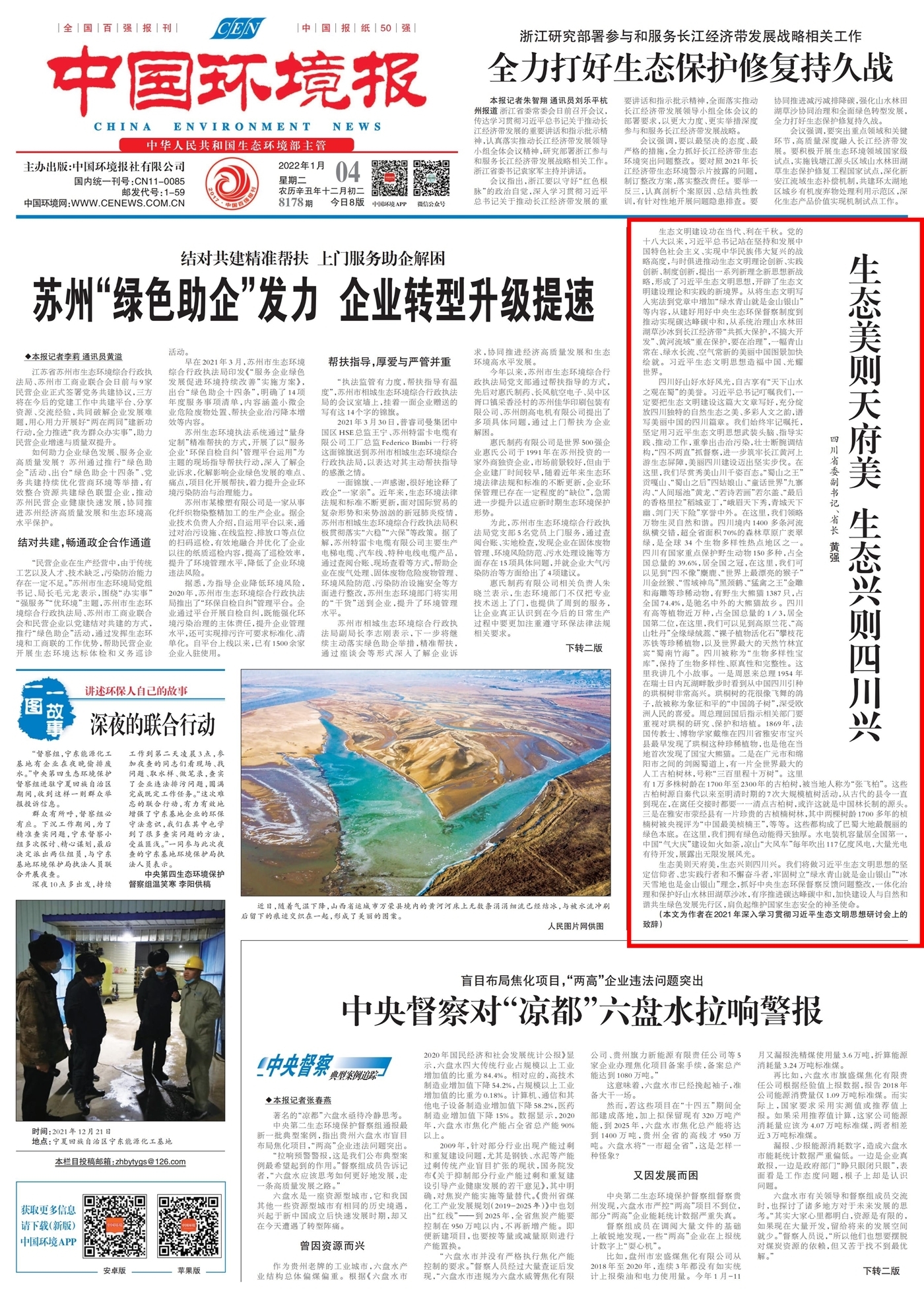 2022年1月4日,中国环境报头版发表四川省委副书记 、省长黄强在2021年深入学习贯彻习近平生态文明思想研讨会上的致辞,全文如下: