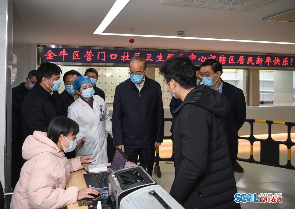 黄强在金牛区营门口社区卫生服务中心,调研基层医疗卫生机构工作情况,看望慰问疫情防控一线医护人员。