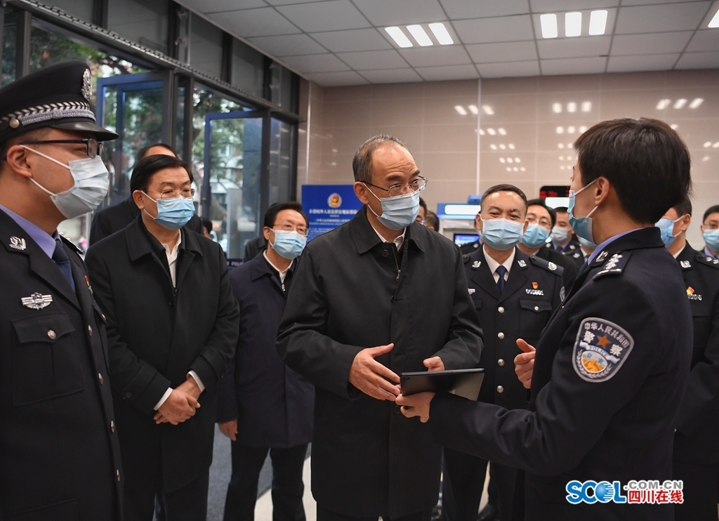 在成都市成华区猛追湾派出所,黄强走进“一站式服务”办证点和值班室,听取线上线下户政便民利民服务等情况介绍,了解值班备勤和突发治安事件应急准备情况,感谢大家为平安四川建设付出的努力。他指出,2022年极为特殊,安保工作极其重要,希望大家集中精力、接续战斗,持续查堵隐患漏洞,创新为民服务方式,全力保护好人民群众的生命财产安全。