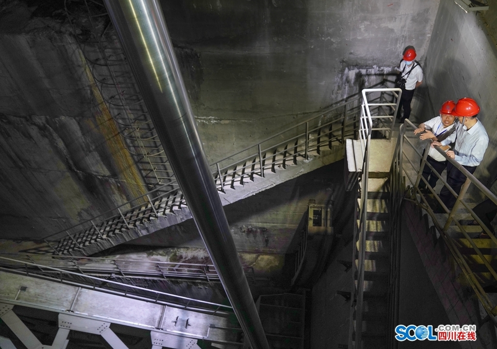 黄强在紫坪铺水利枢纽工程泄洪洞进水塔查看设备安全运行情况。