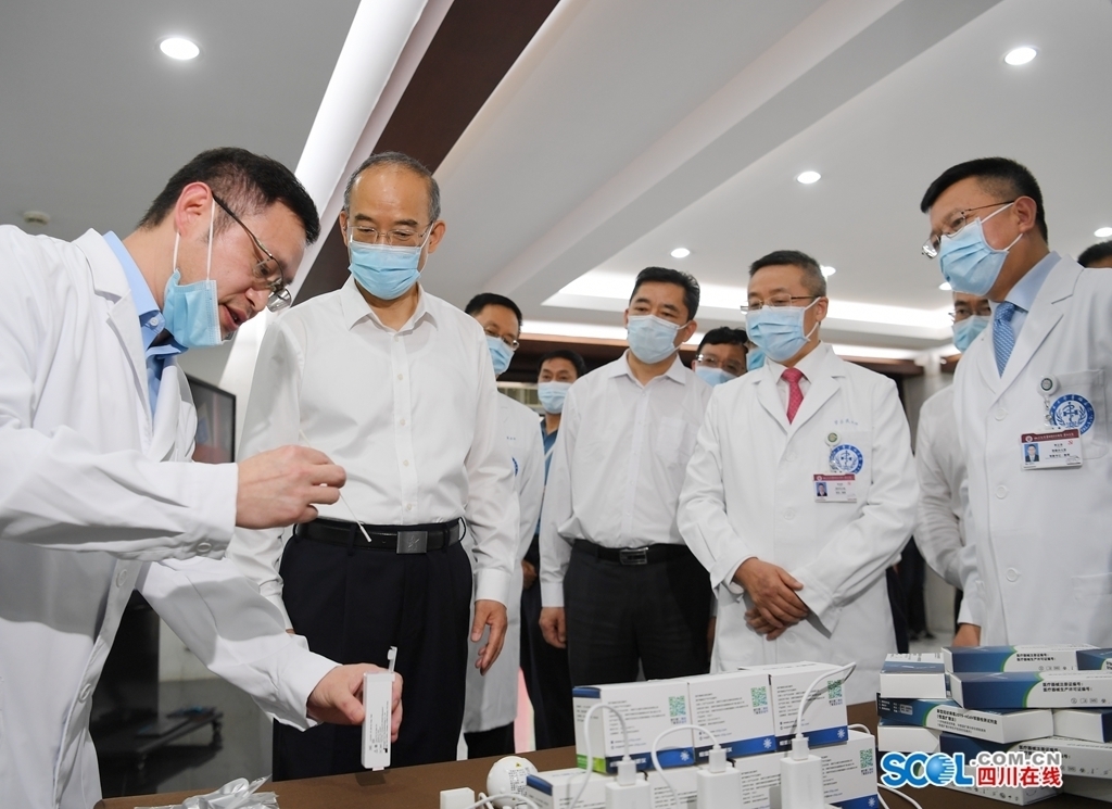 黄强在四川大学华西医院,看望慰问护理工作者代表,听取医院新冠肺炎病毒核酸快速自检技术介绍,察看相关产品。