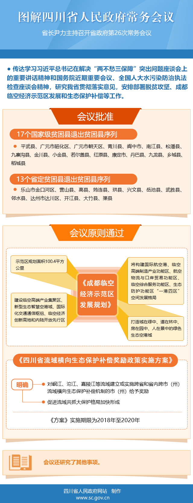 2019年4月28日,省委副书记、省长尹力主持召开省政府第26次常务会议,传达学习习近平总书记在解决“两不愁三保障”突出问题座谈会上的重要讲话精神和国务院近期重要会议、全国人大水污染防治执法检查座谈会精神,研究我省贯彻落实意见,安排部署脱贫攻坚、成都临空经济示范区发展和生态保护补偿等工作。