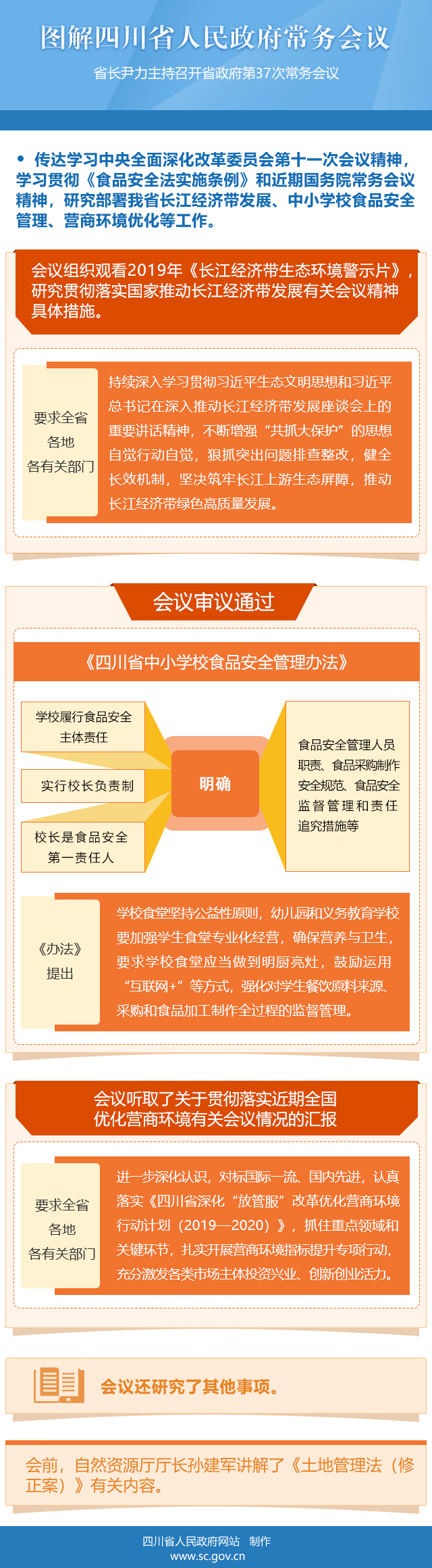 会议审议通过《四川省中小学校食品安全管理办法》,明确学校履行食品安全主体责任,实行校长负责制,校长是食品安全第一责任人,同时对食品安全管理人员职责、食品采购制作安全规范、食品安全监督管理和责任追究措施等进行了明确。《办法》提出,学校食堂坚持公益性原则,幼儿园和义务教育学校要加强学生食堂专业化经营,确保营养与卫生,要求学校食堂应当做到明厨亮灶,鼓励运用“互联网+”等方式,强化对学生餐饮原料来源、采购和食品加工制作全过程的监督管理。