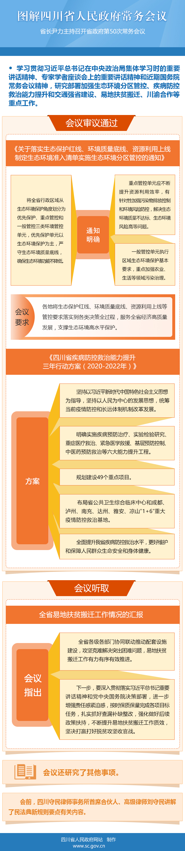 6月19日,省委副书记、省长尹力主持召开省政府第50次常务会议,学习贯彻习近平总书记在中央政治局集体学习时的重要讲话精神、专家学者座谈会上的重要讲话精神和近期国务院常务会议精神,研究部署加强生态环境分区管控、疾病防控救治能力提升和交通强省建设、易地扶贫搬迁、川渝合作等重点工作。