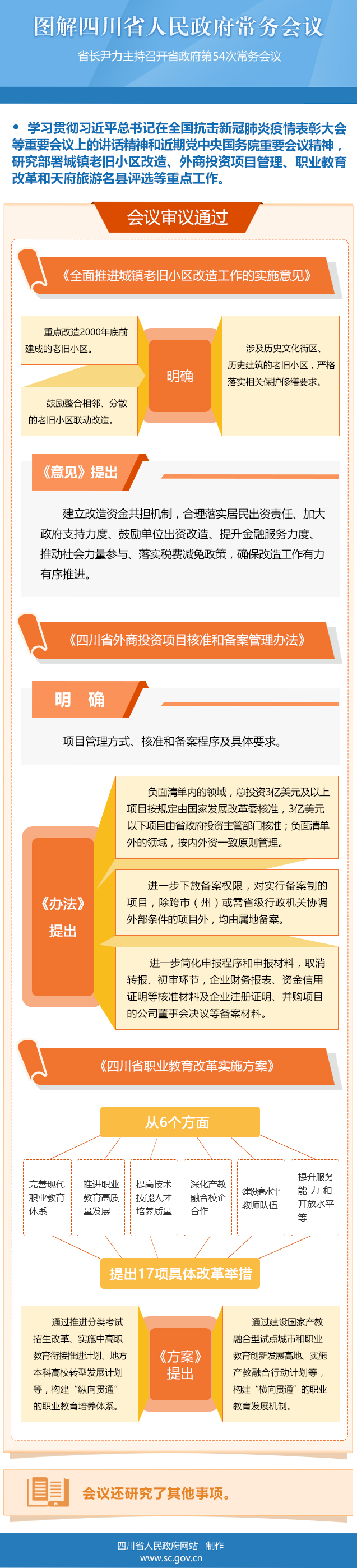 9月10日,省委副书记、省长尹力主持召开省政府第54次常务会议,学习贯彻习近平总书记在全国抗击新冠肺炎疫情表彰大会等重要会议上的讲话精神和近期党中央国务院重要会议精神,研究部署城镇老旧小区改造、外商投资项目管理、职业教育改革和天府旅游名县评选等重点工作。