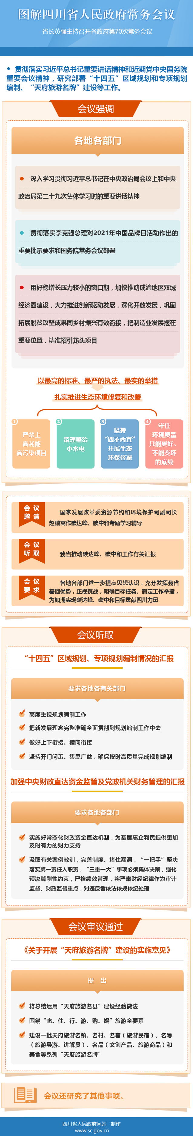 5月12日,省委副书记、省长黄强主持召开省政府第70次常务会议,贯彻落实习近平总书记重要讲话精神和近期党中央国务院重要会议精神,研究部署“十四五”区域规划和专项规划编制、“天府旅游名牌”建设等工作。