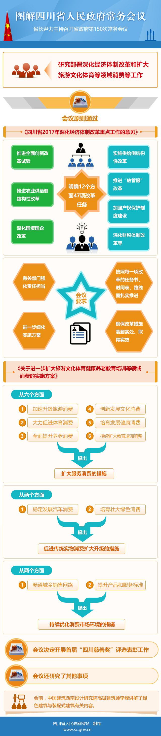 会议原则通过《四川省2017年深化经济体制改革重点工作的意见》,明确推进全面创新改革试验、实施供给侧结构性改革、推进农业供给侧结构性改革、推进“放管服”改革、深化国资国企改革、加强产权保护制度建设、深化财税体制改革等12个方面47项改革任务。会议要求有关部门强化责任担当,进一步细化实施方案,按照每一项改革的任务书、时间表、路线图扎实推进,确保改革措施落到实处、取得实效。
