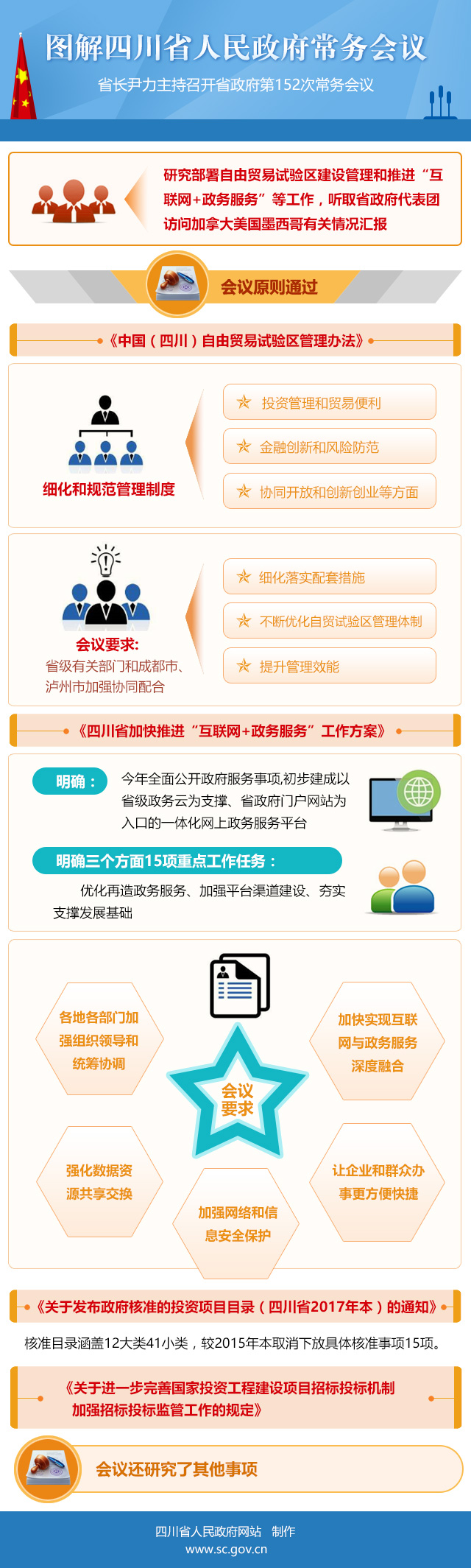 会议原则通过《中国(四川)自由贸易试验区管理办法》,对投资管理和贸易便利、金融创新和风险防范、协同开放和创新创业等方面的管理制度进行了细化和规范。会议要求省级有关部门和成都市、泸州市加强协同配合,细化落实配套措施,不断优化自贸试验区管理体制,提升管理效能。