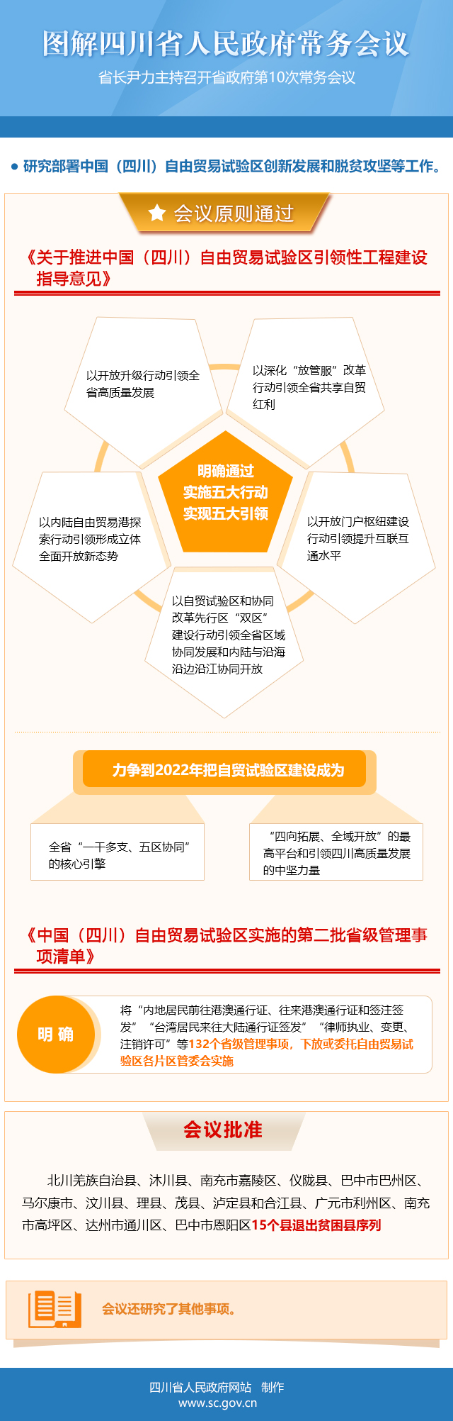会议原则通过《关于推进中国(四川)自由贸易试验区引领性工程建设指导意见》,明确通过实施五大行动实现五大引领——以深化“放管服”改革行动引领全省共享自贸红利、以开放门户枢纽建设行动引领提升互联互通水平、以自贸试验区和协同改革先行区“双区”建设行动引领全省区域协同发展和内陆与沿海沿边沿江协同开放、以内陆自由贸易港探索行动引领形成立体全面开放新态势、以开放升级行动引领全省高质量发展,力争到2022年把自贸试验区建设成为全省“一干多支、五区协同”的核心引擎,“四向拓展、全域开放”的最高平台和引领四川高质量发展的中坚力量。