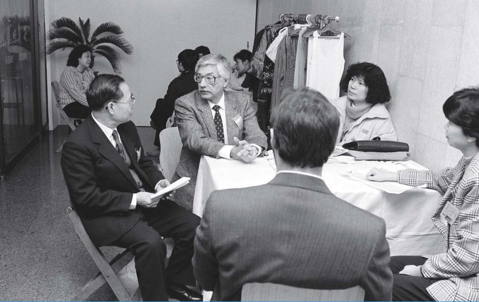 1990 年2 月,中国丝绸交易会在成都举行。图为参会代表座谈交流(新华社 供图)