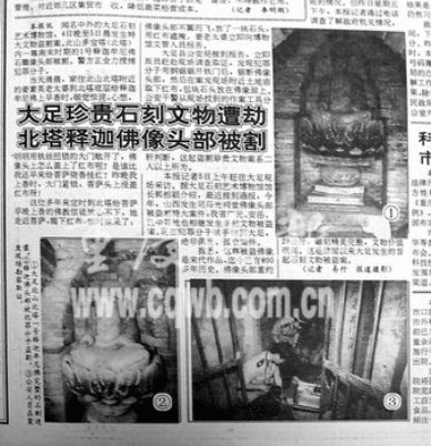 6月4日 大足石刻发生特大文物盗割案,北山多宝塔内底层一尊编号为北塔1号的宋代释迦牟尼石雕佛像头部被盗割。多宝塔建于南宋绍兴年间,案发时系四川省级文物保护单位,被盗割的释迦牟尼佛头像具有重大的历史和艺术价值,属国家一级文物。6月30日,该案告破,被盗石刻释迦牟尼头像被追回;盗割案主犯落网,后经四川省高级法院二审改判为死缓。2006年8月30日,盗割案共犯在重庆市落网,后以盗掘古文化遗址罪被判处有期徒刑15年。
