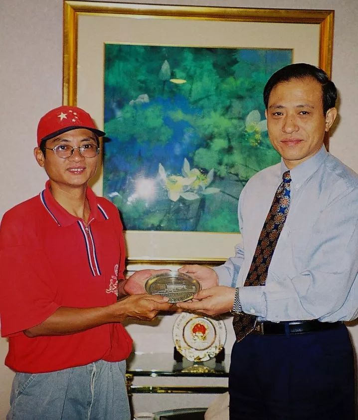 1998年,邹玉麟与中国驻新加坡大使留影(图片来源:环球旅行家邹玉麟的博客)