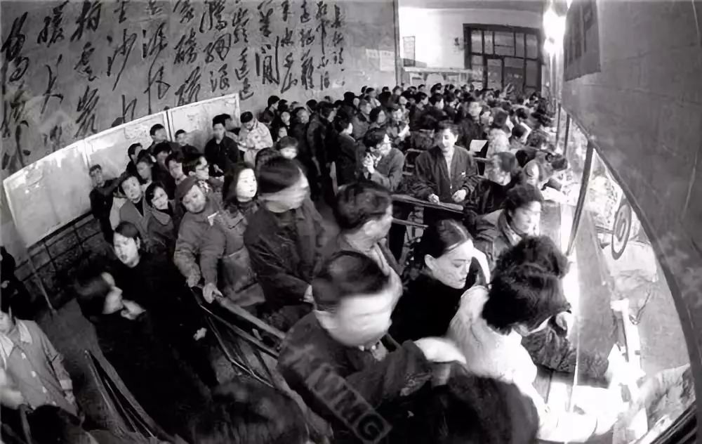 1998年,在四川省展览馆(今四川科技馆)2楼开户炒股的人排班站队。当年这里有信托、国泰、华夏等几家证券交易公司(图片来自网络)