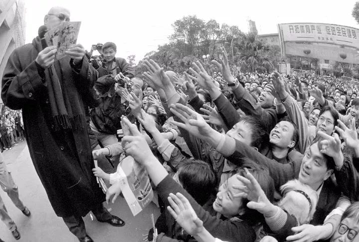 1998年,国产第一台手机在成都体育中心的推广活动,吸引众多市民(图片来源:2018年11月14日《华西都市报》)