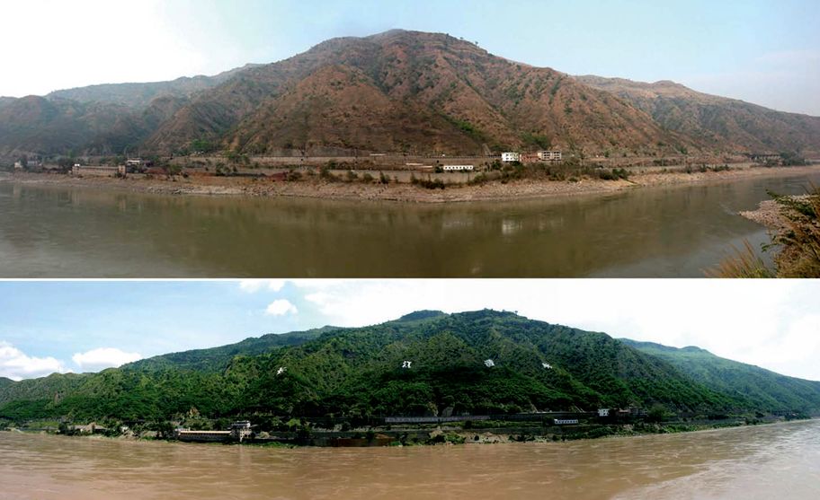 实施天然林保护工程前后的攀枝花市三堆子人工造林区(上图摄于1998 年 下图摄于2008年 新华社 供图)