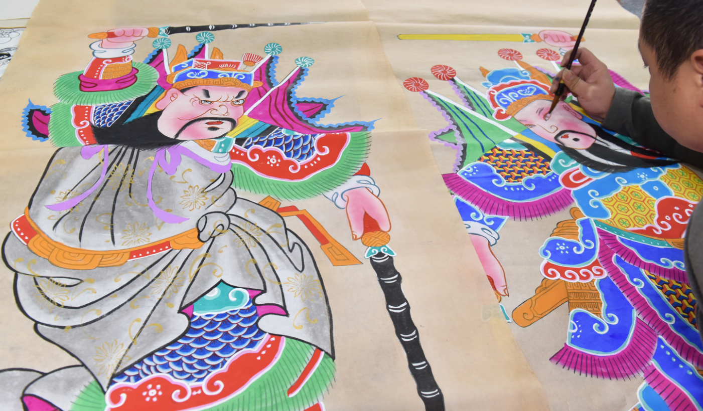 绵竹年画 绵竹年画为民间工艺美术品,中国四大年画之一。由于多以木版印出轮廓而后填色,又称绵竹木版年画。绵竹年画有门画、画条、斗方等品种。技法细腻,造形质仆、粗犷,色彩鲜明,深受西南、西北以及其他一些地区群众的喜爱,并远销东南亚、欧美等国家和地区。绵竹年画始于明末清初,盛于清光绪年间,其形式主要有门画,斗方、画条等。其制作先以木刻版印墨线,再敷以彩绘。制作程式和特色全在于手工施彩和勾线,按民间艺匠通称有以下几种:(一)明展明挂:为绘工精细富丽的一种;(二)勾金:笔蘸金粉或银粉勾出图案;(三)花金:是彩绘后的再加工,用木制花型戳子,拓上金或银色花纹,现所见花戳子约三十几种,分服饰花、帽花、衣角花、袖口花;(四)印金:印过墨线和彩绘后,再用原印版复印一遍胶水(脸手除外),然后撒上金粉或银粉,扫净余粉后即显出金线或银线;(五)水墨:讲究笔墨烘染和淡雅的色调;(六)常形,力求设色单纯;(七)掭水脚:即寥寥几笔大写意,是绵竹年画的特色绘法。