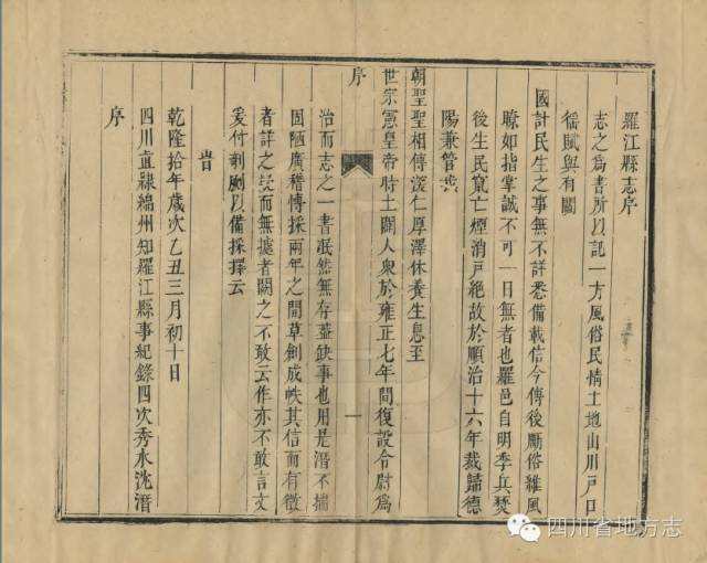 清沈潜、阚昌言等修,周文麟等纂。沈潜,字亦昭,浙江秀水(今嘉兴市)人,监生,乾隆三年(1738)任四川大足知县,乾隆七年(1742)由四川大足知县调任罗江知县。阚昌言,字尧俞,湖北孝感人,雍正进士,乾隆五年(1740)任德阳县知县,乾隆九年(1744)任罗江县知县。参见“【乾隆九年】直隶绵州德阳县志”条。周文麟,字灵昭,江苏震泽(今吴江)人,学生。