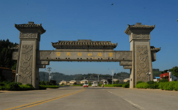 门阙横梁上“司马相如故里”为四川省人大常委会原副主任、著名作家马识途题写。
